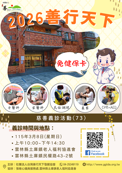 台灣善行天下義診活動將於本周日(3/8)登場囉,敬請把握機會參加。