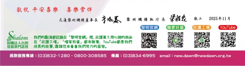 回顧這一年,花蓮置身震災後的恢復期,黎明第二個家不論是機構式服務的教養院、喜樂園、社區居住或是支持進入社區自立生活以及踏入就業的庇護工場及方舟畜牧;黎明在面對外在募款環境的嚴峻、內部服務版圖的擴充、畜牧產業品質提升與數位創新的導入,雖然迎來多項挑戰,卻也完成了服務模式、產業拓展與數位升級的重要里程碑,黎明的團隊仍同心協力、以愛為動力,面對大環境的動盪中非常需要社會大眾的支持及幫助,讓愛的照顧可以持續。