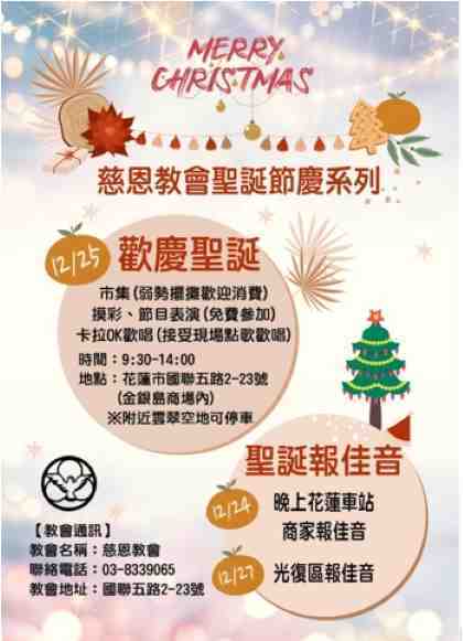 誠摯邀請您與家人、親朋好友一起來參加由慈恩教會主辦、救世慈善協會協辦的2025聖誕系列活動,一起感受節慶的溫馨、音樂的喜悅、市集的愛心與團聚的美好。2025聖誕節,我們期待在花蓮與您相見!
