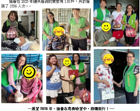 協會在2025年總共服務的案家有130戶,共計服務了3556人次。